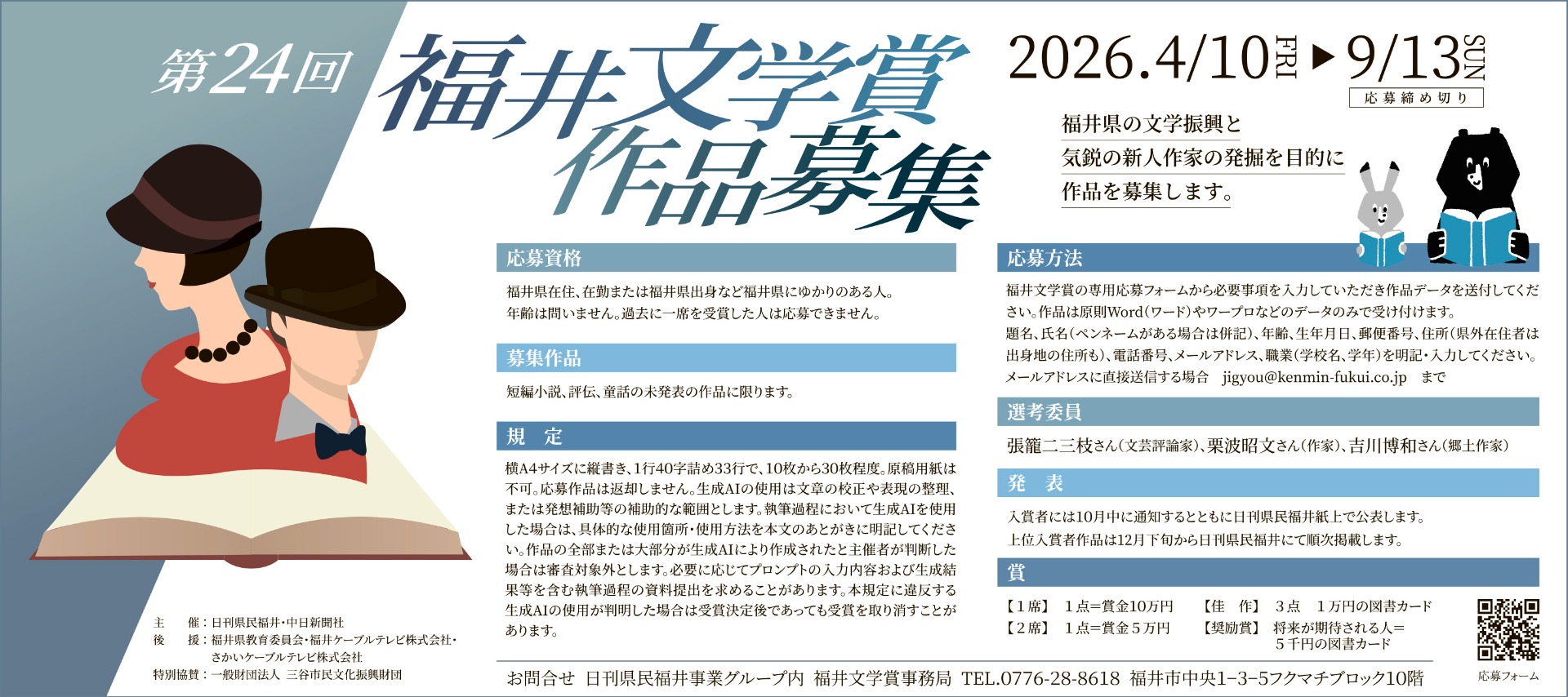問い合わせ:日刊県民福井事業グループ内 福井文学賞事務局 電話 0776ー28ー8618 福井市中央1−3−5フクマチブロック10階